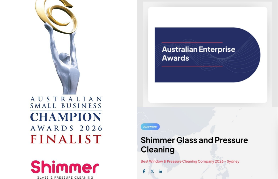 It is inspiring to see Shimmer named as a finalist for the 2026 Australian Small Business Champion Awards. We represent the Cleaning Services category with pride. Additionally, the Australian Enterprise Awards recognised us as the Best Window & Pressure Cleaning Company 2026 in Sydney.